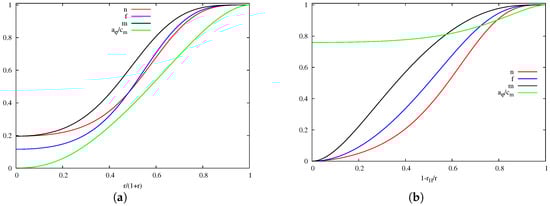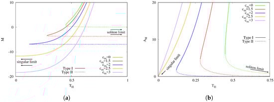 Similar to the vacuum SAdS case, these solutions exist above a minimal value of temperature only. This minimal temperature decreases with increasing , reaching zero as . In fact, when , the type II branch completely disappears. Consider for example, the curves for  (orange solid line) and  (purple solid line) in Figure 3a,b. One can see that only type I BHs are found in these cases, and their temperature can reach . However, contrary to what happens for the electrically charged Reissner–Nordström-AdS BHs, the extremal limit does not correspond to a regular configuration. Although the mass approaches a finite value there, the horizon area vanishes. In fact, the configurations with  possess divergent Ricci and Kretschmann scalars at the horizon.