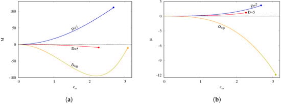 In Figure 2a, we show the mass M vs. the parameter , the dots marking the position of the limit solutions at . One can notice that the  curve depends on the value of the spacetime dimension. However, the mass remains finite as .