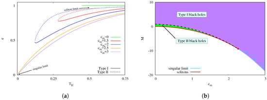 Then, the magnetized BHs are found in the shaded area, which represent regular configurations with different temperatures. The type I BHs fill the purple area and are always above the configurations with minimum temperatures (that set is marked in Figure 4b with a dashed black line). The type II BHs connect with the soliton limit and fill the green area between the solitons (red line) and the minimum temperature configurations (dashed black line).