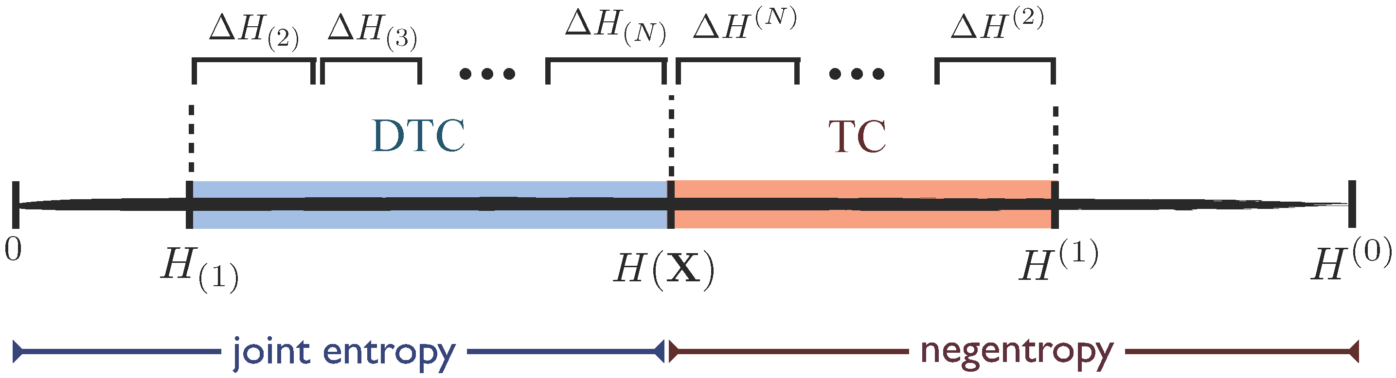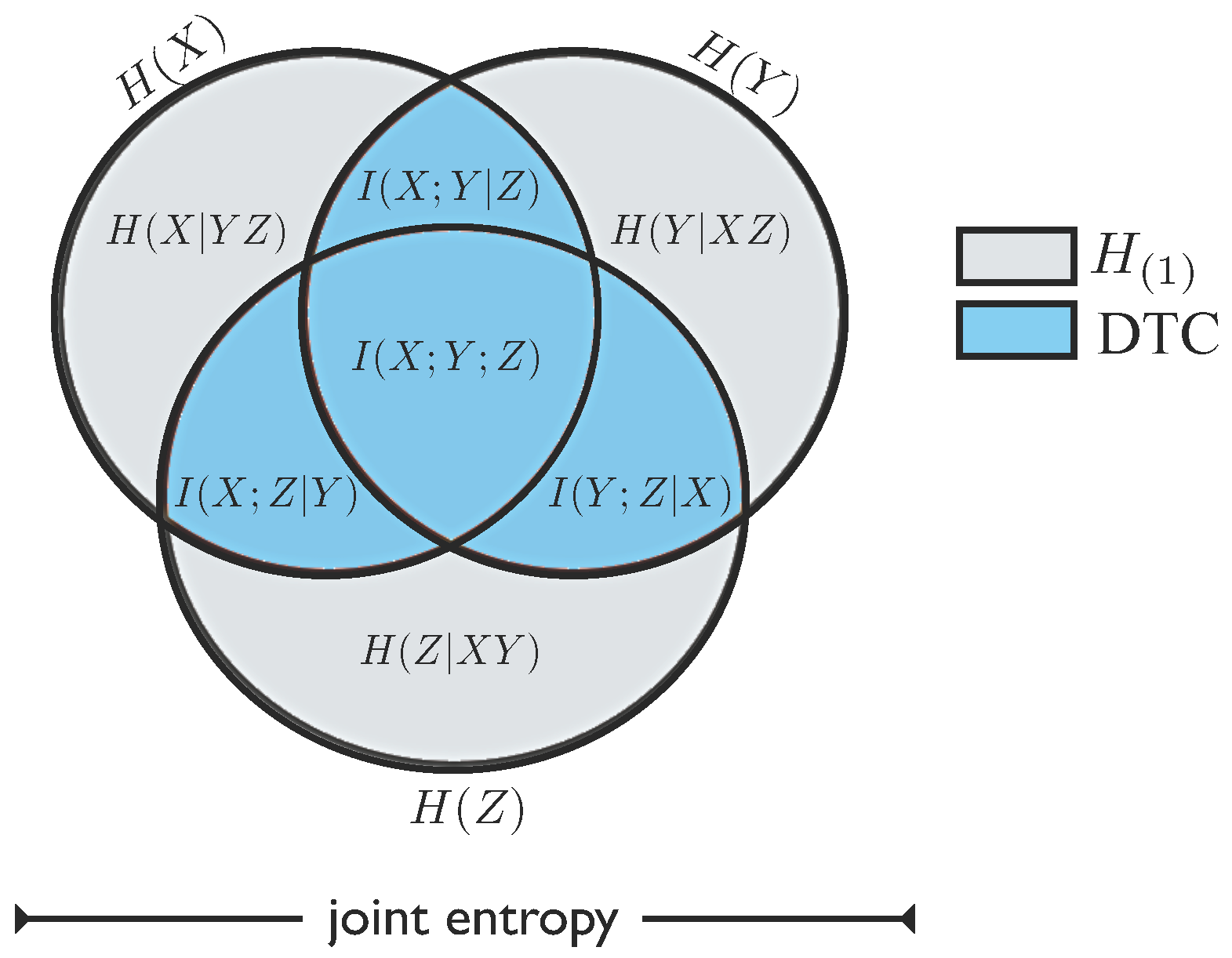 which measures the portion of the joint entropy that is shared between two or more variables of the system (the superscripts and subscripts are used to reflect that ). When , then , and hence, the DTC has also been suggested in the literature as a measure for the multivariate mutual information. Note that the DTC is also known as excess entropy in [26], whose definition differs from its typical use of this term in the context of time series, e.g., [27].