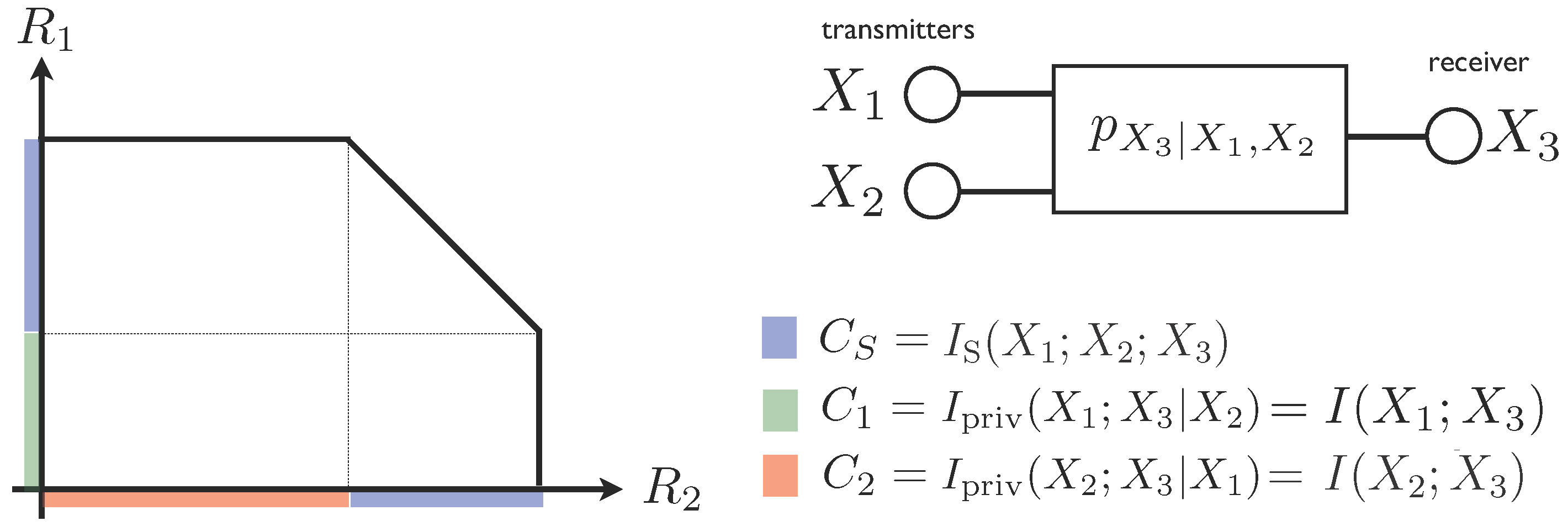 Let us consider a multiple access channel, where two pairwise independent transmitters send and and a receiver gets , as shown in Figure 3. It is well known that, for a given distribution , the achievable transmission rates and satisfy the constrains given by ([53], Section 4.5)