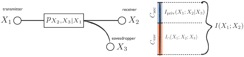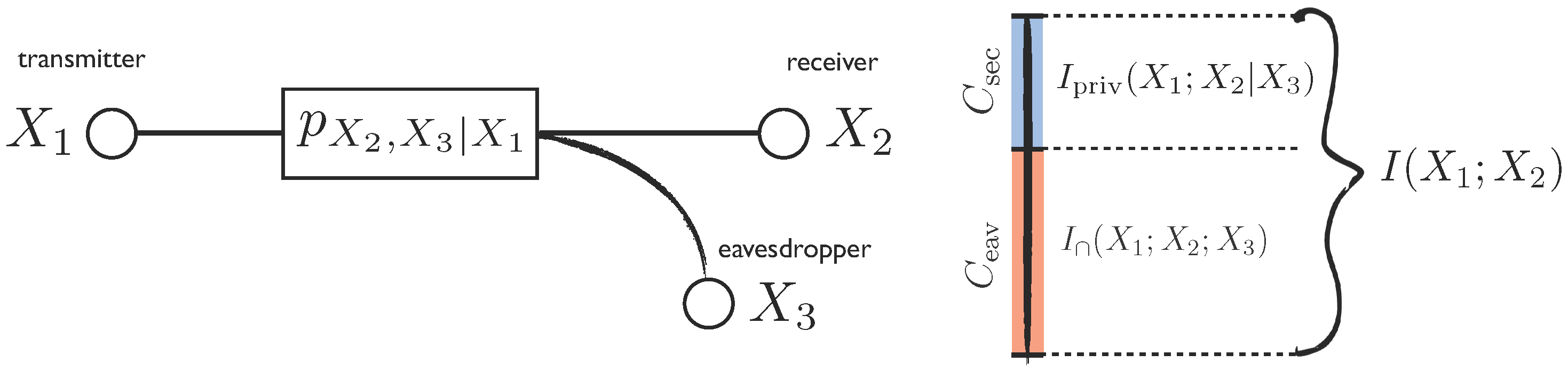Consider a communication system with an eavesdropper (shown in Figure 4), where the transmitter sends , the intended receiver gets and the eavesdropper receives . For simplicity of the exposition, let us consider the case where the eavesdropper gets only a degraded copy of the signal received by the intended receiver, i.e., that form a Markov chain. Using the results of Section 5.2, one can see that in this case, there is no synergistic, but only shared and private information between , and .