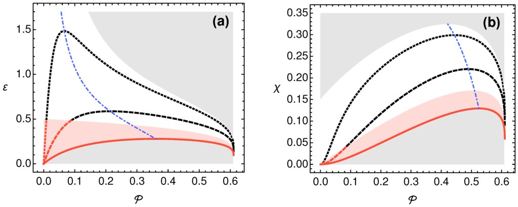As we can see, the quantum correlations between registers and ancillas after the measurement step are symmetric under the exchange of the parties. It is also noteworthy that , at variance with the entropy reduction rate , does not depend on the polarization bias of the ancillary spins , but only on and the measurement direction ϕ. Crucially, this implies that the performance characteristics introduced in Section 3.2 are all curves of constant discord. In particular, the maximization of at fixed occurs now as , which is compatible with the optimization of the objective function χ, as well as that of the COP and η. This observation is suggestive of a deep connection between quantum discord and the thermodynamic performance of the spin refrigeration cycle: while all figures of merit increase monotonically with the total, classical and entangled correlations at fixed entropy production rate, only the quantum share of correlations is seen to grow monotonically with χ, ε and η at any cooling load .