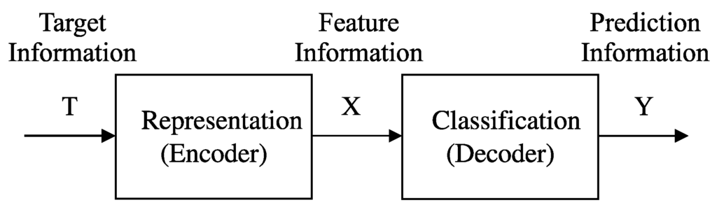 Classifications can be viewed as one component in pattern recognition systems [30]. Figure 1 shows a schematic diagram of the pattern recognition systems. The first unit in the systems is termed representation in the present problem background but called encoder in communication background. This unit processes the tasks of feature selection, or feature extraction. The second unit is called classification or classifier in applications. Three sets of variables are involved in the systems, namely, target variable T, feature variables X, and prediction variable Y. While T and Y are univariate discrete random variables for representing labels of the samples, X can be high-dimensional random variables either in forms of discrete, continuous, or their combinations.