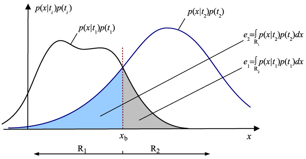 Based on the definitions above, for the given joint distribution, the Bayesian error is unique, but the non-Bayesian errors are multiple. Figure 2 shows the Bayesian decision boundary, , on a univariate feature variable x for equal priors. The Bayesian error is . Any other decision boundary different from will generate the non-Bayesian error for .
