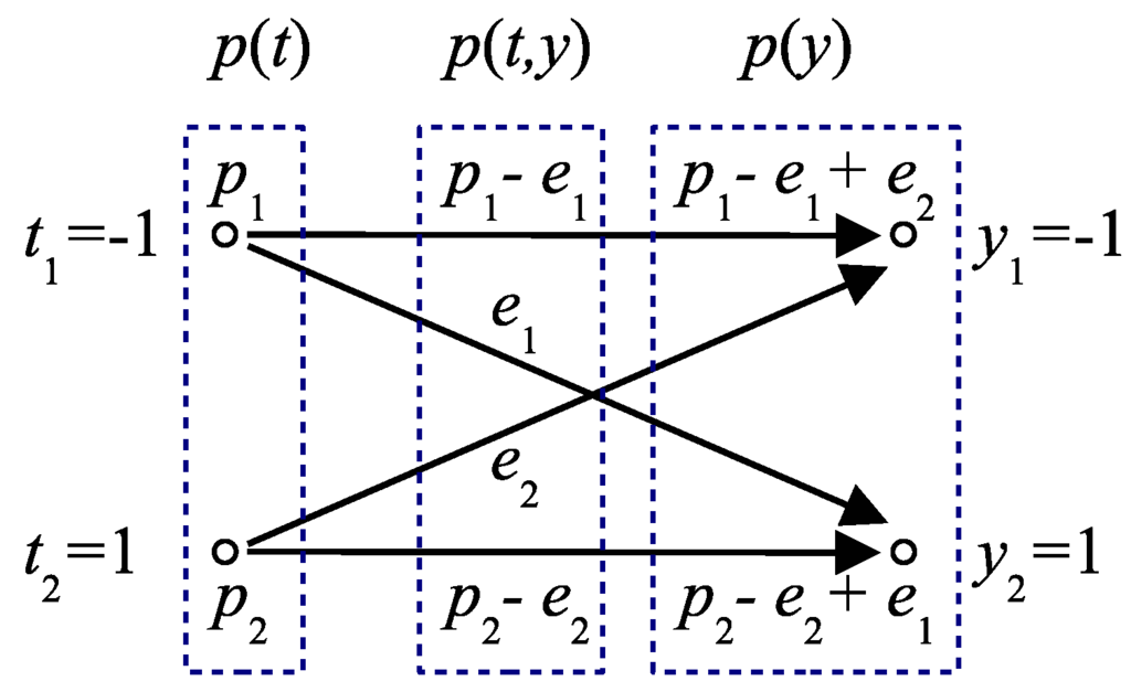 Graphic diagram of the probability transformation between variables T and Y in a binary classification (or channel). Instead of using conditional probability , joint probability distributions are applied to describe the channel.