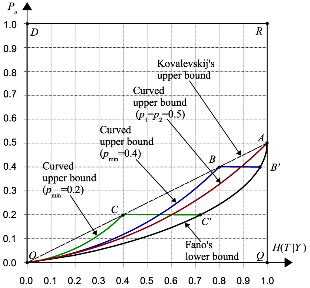In information theory, the relations between entropy and error probability are one of the important fundamentals. Among the related studies, one milestone is Fano’s inequality (also known as Fano’s lower bound for the error probability of decoders), which was originally proposed in 1952 by Fano but formally published in 1961 [1]. It is well known that Fano’s inequality plays a critical role in deriving other theorems and criteria in information theory [2,3,4]. However, within the research community, it has not been widely accepted exactly who was first to develop the upper bound for the error probability [5]. According to [6,7], Kovalevskij [8] was recognized as the first to derive the upper bound of the error probability in relation to entropy in 1965. Later, several researchers, such as Chu and Chueh in 1966 [9], Tebbe and Dwyer in 1968 [10], Hellman and Raviv in 1970 [11], independently developed upper bounds.