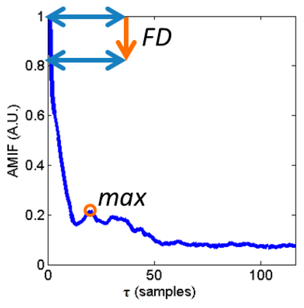 Auto mutual information function (AMIF) is calculated as the mutual information between two measurements xi and xi + τ taken from a single time series. This function describes how the information of a signal (AMIF value at τ = 0) decreases over a prediction time interval (AMIF values τ > 0). In the case of a completely regular and deterministic signal, the AMIF would repeat a specific pattern for all τ. In the case of an uncorrelated random signal, the AMIF would become zero for all τ apart τ = 0. Therefore, an information loss increasing with τ is related to a gradual decrease of signal predictability and a gradual increase of signal complexity [33]. AMIF can be computed from Rényi entropy as: