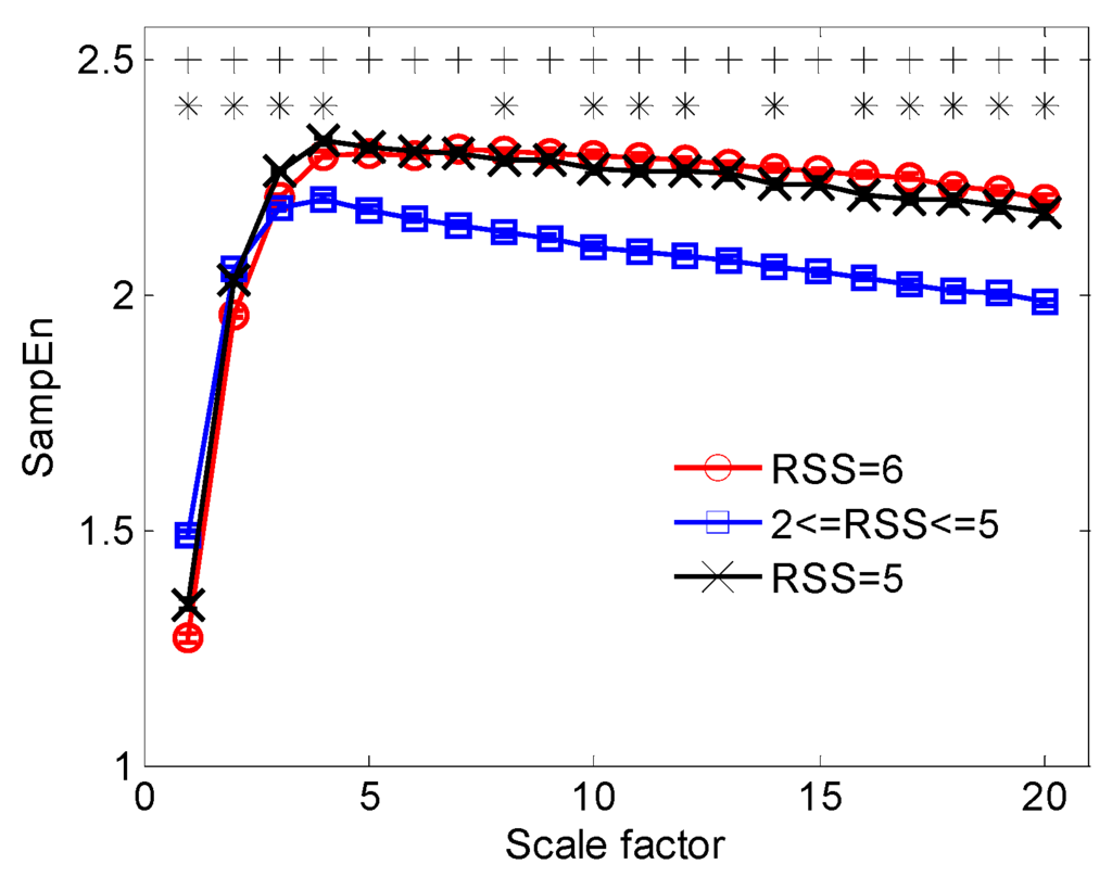 Refined multiscale entropy (RMSE) [22,30,31] was applied as a technique of multiscale analysis in which sample entropy (SampEn) [32] is computed at different time scales (ts) of the EEG windows, given information of the regularity of the signal in each one of the time scales. In this way, given a time series x = {x(i), i = 1, …, N}, where i is the sample counter and N is the series length, SampEn estimates the probability that two patterns of length L, xL(i) = (x(i), x(i − 1), …, x(i − L + 1)) and xL(j) = (x(j), x(j − 1), …, x(j − L + 1)), that are similar in the L-dimensional phase space remain similar after adding new samples x(i + 1) and x(j + 1), i.e., xL + 1(i + 1) and xL + 1(j + 1) are still similar in the (L + 1)-dimensional phase space. Two patterns are similar if the distance between them is less than a tolerance parameter “r”. In this work, RMSEts represents the sample entropy computed at the time scale ts. RMSE provides two refinements of MSE: (i) it offers a way to improve the procedure devised to eliminate fast time scales, avoiding the aliasing effects; and (ii) it modifies the coarse graining procedure in such a way that reduction of the variance in the EEG, because the elimination of fast time scales, does not tend to artificially decrease entropy rate as a function of the time scale. The result is a more reliable method for the assessment of entropy-based complexity as a function of the temporal scale. The process was iterated with scale factors ranging from 1 to 20 and SampEn was plotted as a function of ts. The procedure to calculate RMSE is similar to that to compute MSE except for two substantial variations: (i) the suboptimal FIR filter that is used in MSE was substituted with an sixth order low-pass Butterworth filter, limiting as much as possible aliasing at any scale factor during undersampling; (ii) the parameter r setting the tolerance for the calculation of the SampEn was continuously adapted with the scale factor ts, thus preventing the dependence of RMSE on the change of variance induced by the procedure of elimination of the temporal scales. In this work, SampEn was calculated with r = 0.15 × SD(ts) and L = 2, where SD(ts) is the standard deviation of the EEG signal at each ts and L is the length of the patterns used to find similitudes in the signal. We make reference to [22] for specific details on the method.
