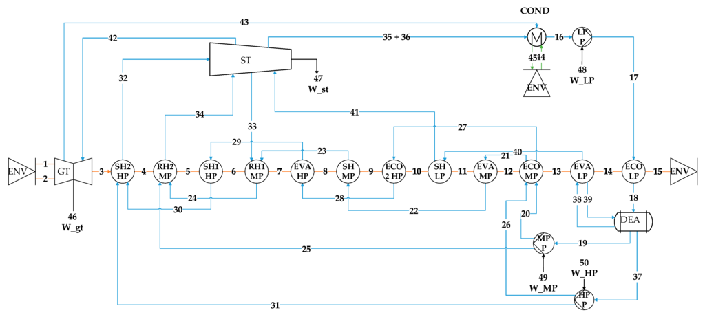 In order to apply TIOA, the physical structure of the power plant is simplified as in Figure 4. All the exergy fluxes are grouped according to the RPL criterion and the functional diagram of the plant is derived, as depicted in Table 4.