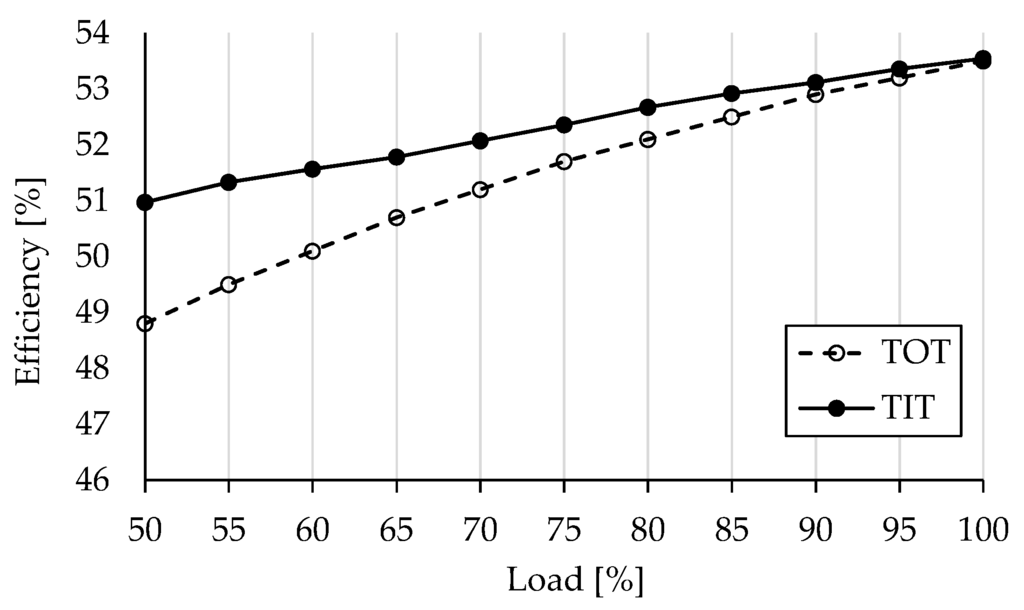 As can be seen in Figure 5, the exergy efficiency of the plant decreases during partial load operation with both TIT and TOT control mechanisms. However, with the TIT control, the efficiency decreases less and the power plant is more efficient at low loads. Therefore, for prolonged operation at low capacity factors, TIT control is advised.