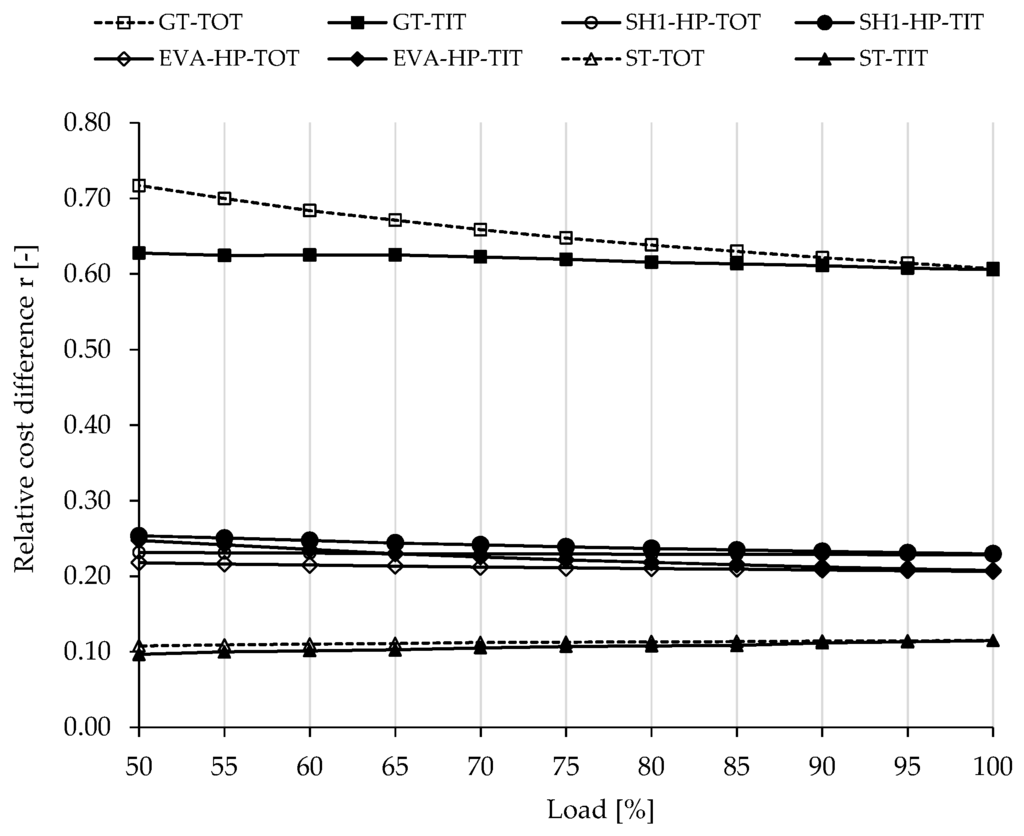 An increase in the Relative cost difference represents an increase of the specific cost of the product of the component, with fixed cost of the fuel—this mirrors a decrease in the efficiency. The results show that, although the TIT control always leads to a globally higher efficiency, some components may individually be more costly. Therefore, improvements may be considered for these components. Specifically, for the gas turbine, the performance is better with TIT at partial load, while the performance of the high pressure evaporator and first high pressure super-heater is worse with TIT control.