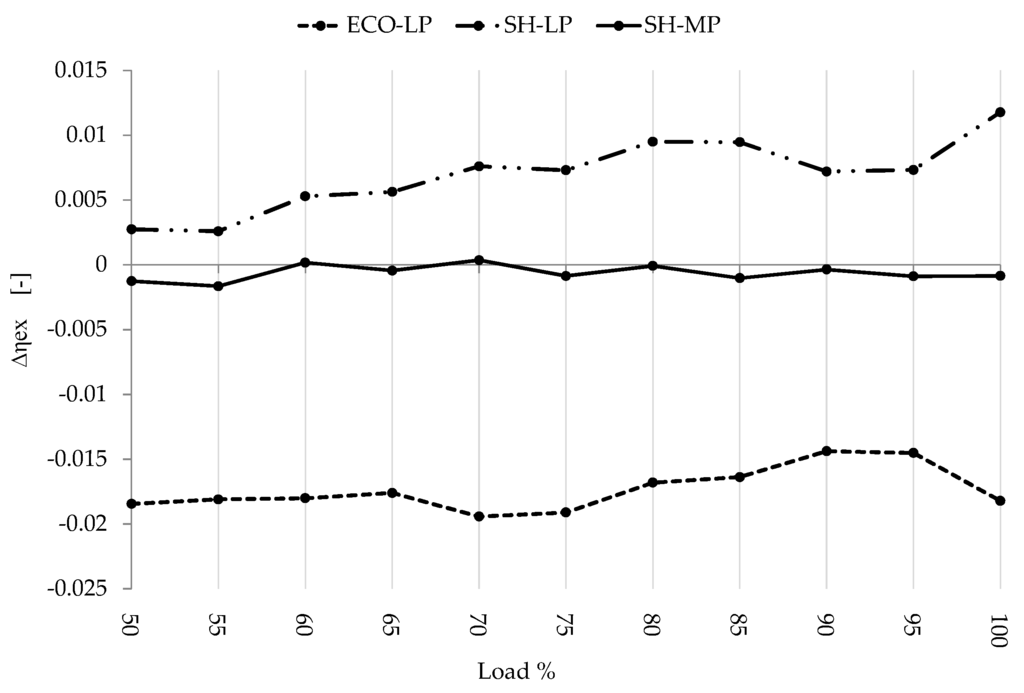 In the present case, the efficiency of the low pressure economizer is reduced by decreasing the overall heat transfer coefficient U, assumed as a proxy for the fouling. This component is chosen since the low temperature heat exchangers are subject to fouling more than others. Figure 7 shows the relative difference of the exergy efficiency of other heat exchangers in the HRSG when the heat transfer coefficient of the ECO-LP is decreased by 10%. The only considerable effect is noticed in the low pressure super-heater, and it is positive. The changes in efficiencies on the other heat exchangers are negligible. The super-heater counterbalances the effects of a reduction in the efficiency of the economizer, and this is due to the reduction in the mass flow rate of steam produced—when the economizer is subject to fouling, the temperature difference between the water and the gases increases, while the pressure and the mass flow rate slightly decrease. The super-heater is sensitive to this decrease, since it elaborates a much lower mass flow rate. Consequently, the temperature difference across it decreases and its efficiency increases. The effect is less intense at lower loads. The fluctuations of the curves are due to a number of interactions between the control mechanisms of all the components in the power plant, but they are limited and do not prevent clear trends to be identified for the low pressure economizer and super-heater. The numerical inaccuracy does not affect these trends, since it is found to be three orders of magnitude smaller than the variations in Figure 7.