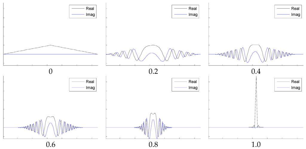 Here, j represents the imaginary unit. For the tea images, we need to extend FRFT to the two-dimensional space. Two angles exist for 2D-FRFT, α and β [37,38,39,40]. Furthermore, the results of FRFT with angles from 0 to 1 are listed in Figure 2. A triangular signal tri(t) is used, and its frequency spectrum is sinc2(u) [41]. In the figure, black lines represent real components, and blue lines imaginary components.