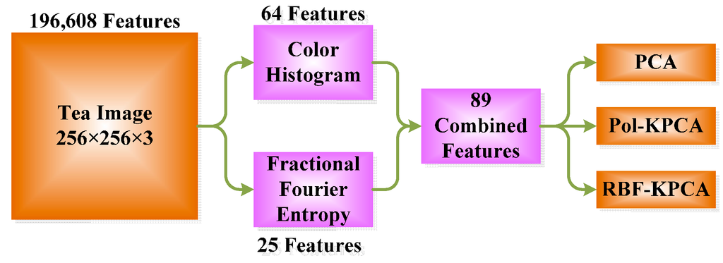 As a result, 89 features were extracted from a particular tea image. We used three feature reduction approaches (PCA, POL-KPCA, RBF-KPCA) to further reduce them.