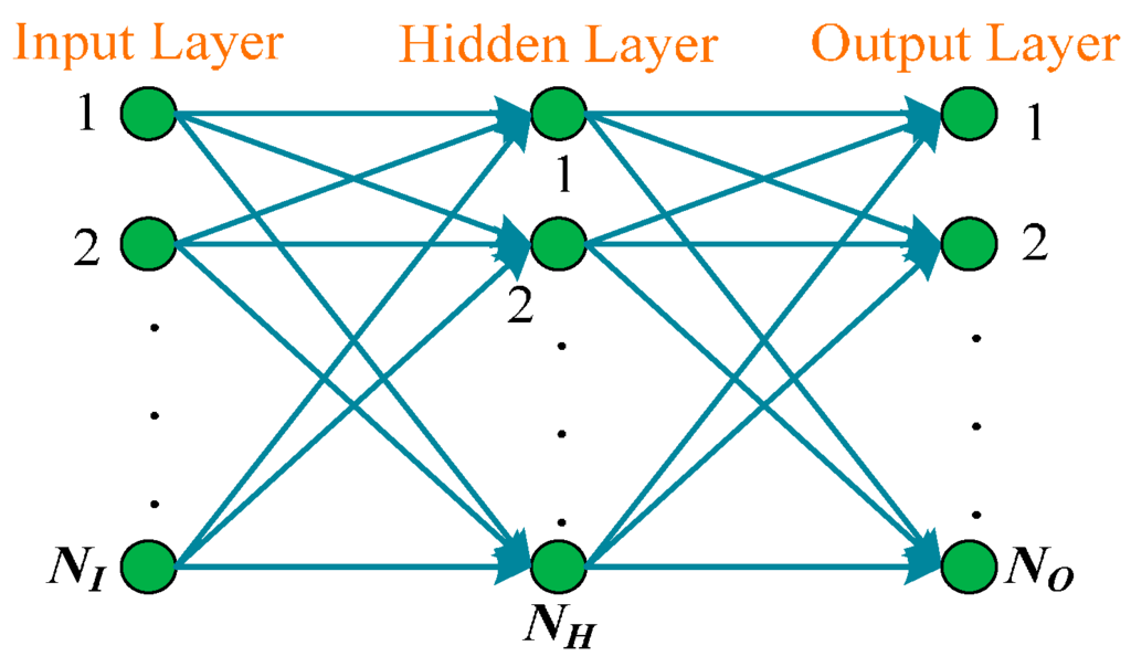 Figure 4 illustrates the general one-hidden-layer (OHL) FNN. Within this model, there are three different types of layers: an input layer, a hidden layer, and an output layer. Their neuron numbers are represented as NI, NH, and NO, respectively. The activation function is selected as sigmoid and linear for the hidden layer and output layer, respectively.