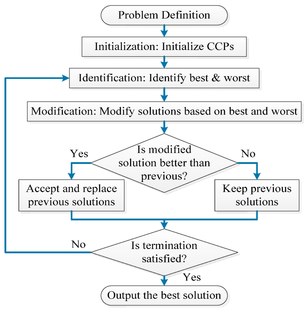where A(i, j, b) and A(i, j, w) represents the best and worst value of j-th variable in i-th iteration. The r(i, j, 1) and r(i, j, 2) are two random numbers in the range of [0, 1] generated at random. The second term “r(i, j, 1)(A(i, j, b) − |A(i, j, k)|” indicates the candidate should move closer to the best one, while the third term “−r(i, j, 2)(A(i, j, w) − |A(i, j, k)|” indicates that the candidate should move further away from the worst one (note the minus symbol before r). The A(i+1, j, k) is accepted if the modified candidate is better in terms of function values, otherwise the previous A(i, j, k) is maintained.
