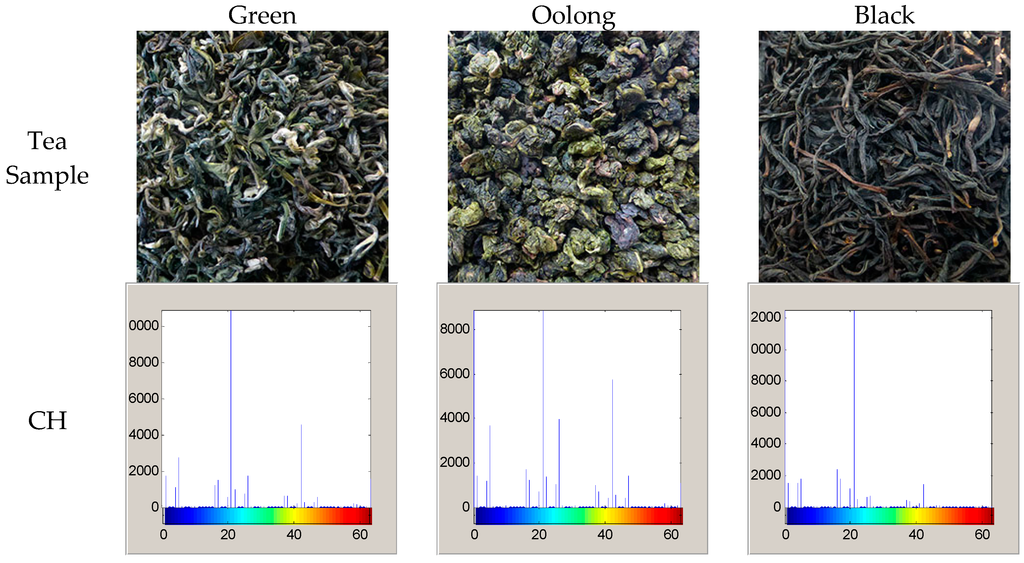 Figure 6 shows one sample of three categories of teas. It also shows their corresponding color histogram (CH). The x-axis represents the 64 bins, while the y-axis represents the pixel number. Figure 6 validates the distribution of color histograms of green, Oolong and black teas were distinct from each other; therefore, the color histogram is an efficient measure for tea-category identification.