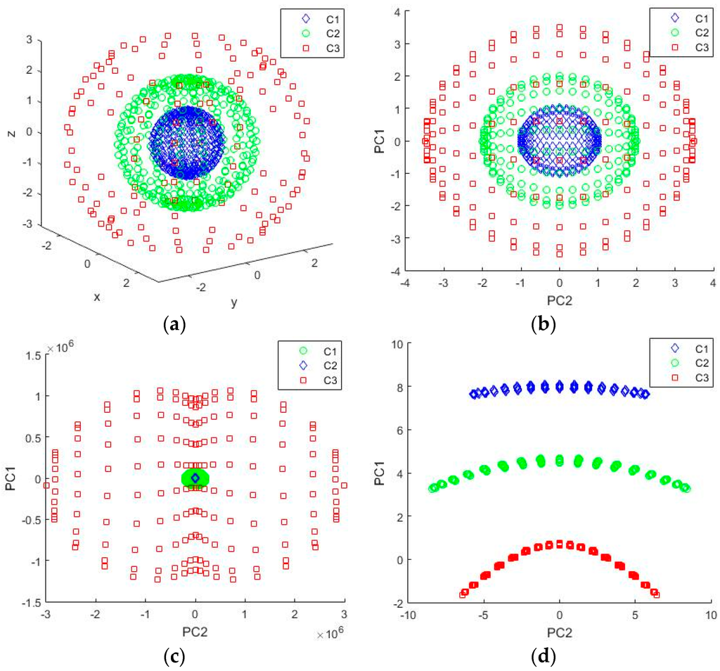 Figure 8 shows how KPCA extends the data to non-linear feature maps for simulation data. Figure 8a shows a three-dimensional three-class dataset. Points in class 1, class 2, and class 3 are distributed along three spheres with the same origin and different radii of 1, 2, and 3, respectively. Both PCA and KPCA reduced the features from 3 to 2. Figure 8b–d shows the feature reduction results by PCA, KPCA with polynomial kernel, and KPCA with RBF kernel, respectively.