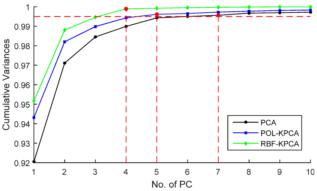From curves in Figure 9, we can see that the PCs selected under the same threshold of 99.5% are four, five, and seven for RBF-KPCA, POL-KPCA, and standard PCA, respectively. We can conclude that RBF-KPCA is superior to the other two approaches in reducing features in terms of cumulative variance. The result falls within the finding set out in Section 6.4.
