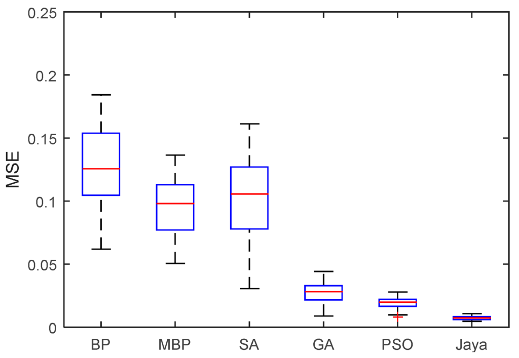 We compared the Jaya method with different training methods: BP, MBP, GA, PSO, and SA. The maximum iterative epochs (MIEs) of all approaches are determined as 1000, since this value is rather large for such a small network. Actually, some approaches will converge at about 50 epochs. Hence, Figure 10 shows the ability to converge to a global optimal point. The populations are all set to 20. The ASPs of each algorithm were obtained by trial-and-error approach. Their values are listed in Table 4. The average and standard deviation (SD) of MSEs are shown in Figure 10, and their detailed data is shown in Table 5.