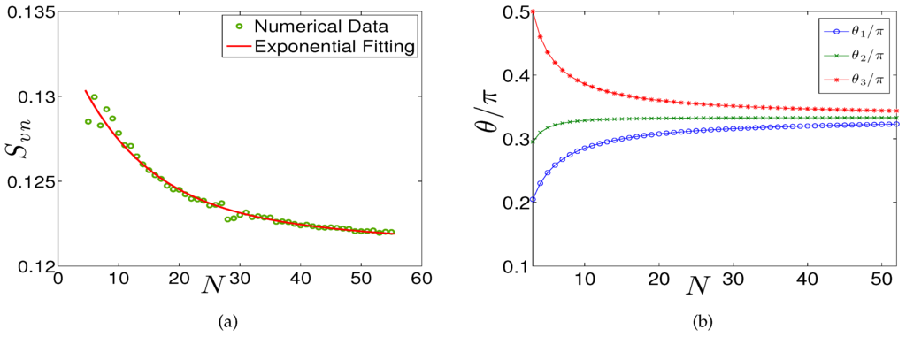 In (a) the von Neumann entropy of entanglement for the ground state eigenfunctions of the irrational triangles is plotted against the different triangle configurations. It can be easily seen that in both cases the entanglement entropy reduces as we increase N or as we approach the equilateral triangle. Red curve shows the exponential fit of data, where the equation of the curve is given by , where , and . In (b) the angles of the triangle , and are plotted for different triangle configurations and it can be seen that as N grows, the angles approaches the rational value of .