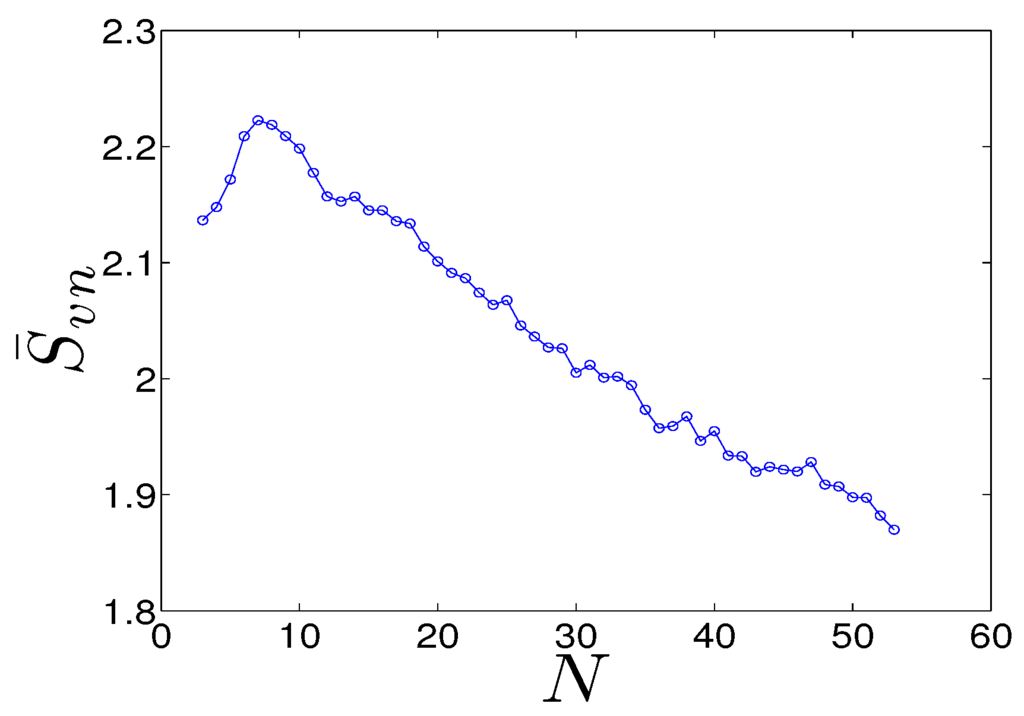 The average von Neumann entropy of entanglement is plotted against the different triangle configurations. It can be easily seen that the entanglement entropy reduces as we increase N or as we approach the equilateral triangle.
