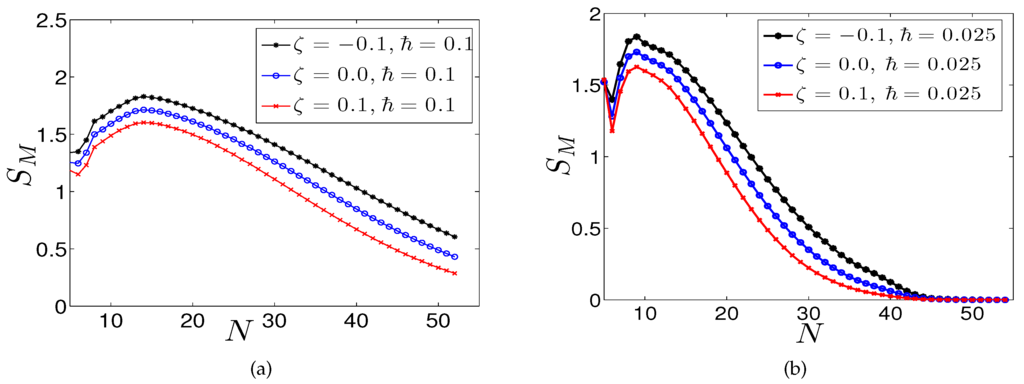 In order to further explore the dependence of the quantum entanglement on the geometry of the triangular billiard, we compute the maximum value of the entanglement for different triangular configurations. In Figure 6a,b we plot the maximum value of the entanglement entropy for different triangle configurations. In both figures (Figure 6a,b), blue lines show the entanglement maxima for the coherent states with and respectively. Similarly the black line shows the entanglement maxima for the negatively squeezed state and the red line shows the positively squeezed state. In our definition of the wave function, the negatively squeezed state gives a wave packet spread in the positions coordinates, hence it collides with the walls of the triangular billiard much faster and the entanglement develop much earlier and it gives a higher entanglement maxima. According to our definition of the wave packet, the positively squeezed state is highly localized in the position space and the wave packet takes more time to collide with the walls of the triangle and it shows a smaller entanglement entropy. From Figure 6b it can be easily seen that, for the coherent state in the semiclassical limit, we get the similar result obtained for the irrationality of the triangle with the ground state eigenfunctions. It can be seen that the entanglement entropy is higher for a triangular configuration with N closer to 10. The entanglement maxima also shows the dependence on the irrationality of the triangle. We can also see that the squeezing can enhance or reduce the entanglement which depends on the sign of the quantum squeezing or in other words, it depends on whether we localize the wave function or spread it in the position coordinate.