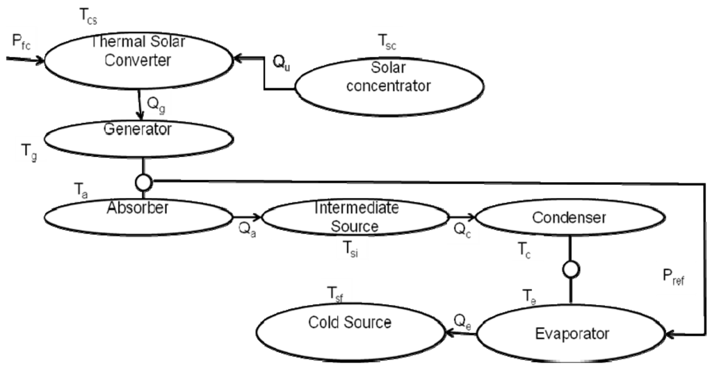 The solar absorption refrigeration cycle is presented in Figure 1. It is composed of a solar concentrator, i.e., the solar collector (heat source), a thermal solar converter (TE1), an intermediate source, a cold source, and four main elements: a generator, an absorber, a condenser, and an evaporator. The generator and the absorber constitute a thermal engine TE2, while the condenser and the evaporator form the thermal receptor TR. The exchanged fluxes and powers that reign in the different compartments of the machine are mentioned in Figure 1. The parameterization of the installation comprises fluxes and powers as well as temperatures reigning in the different compartments of the machine. The Pref is the refrigeration power.