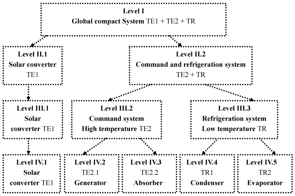 The hierarchical decomposition of the solar absorption refrigeration cycle is illustrated in Figure 2. The four subdivision levels of the hierarchical decomposition are: the first level (L.I), which is the compact global system (TE1 + TE2 + TR). It is divided into two sublevels (L.II.1 and 2): the thermal converter (TE1), and the command and refrigeration system.