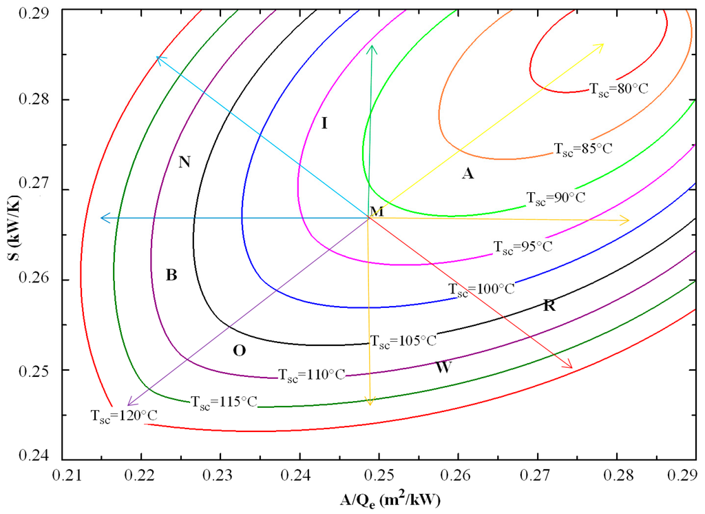 It should be noted that, even if we encourage work in one zone more than another, all the “rainbow” domains are generally good as they are in a good range, i.e., 0.21 < A/Qe < 0.29 m2/kW, slightly lower than that derived by Berlitz et al. [14] for the technico-economical criterion, which is 0.3 < A/Qe < 0.6 m2/kW. According to Fellah et al.’s [4] work, a variation of 70% in the performance is related to a variation of 80% on the technico-economical criterion. In our case of study, a variation of 27.6% on the technico-economical criterion is related to a variation in the internal entropy rate of approximately 17% for Tsc working range, and Tsf = 10 °C and Tsi = 28 °C.