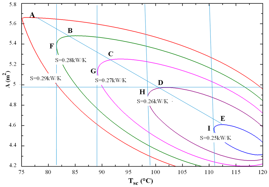 The intersection between all the entropies curves and their horizontal tangents allows for the determination of the maximums of refrigerator area allowed for each heat source temperature and the appropriated endoreversible irreversibility expected. All of these maximums are aligned. The line regrouped these maximums of area divides the domain into two regions. Indeed, it corresponds to the principle domain separation line, which allows us to distinguish between two principle domains: The first one is characterized by a proportional variation of the entropies with heat source temperature for fixed total refrigerator area, while the second domain is characterized by an inversely proportional internal entropy rate variation for fixed refrigerator area. Consider point D, for example, of this principle domain separation line. It can be seen that this point corresponds to the maximum total area for a work temperature Tsc, equal to approximately 101 °C. The internal entropy rate is equal to 0.26 kW/K. It is the intersection between the corresponded internal entropy rate curve and its horizontal tangent. The tangent passing from D (i.e., for a fixed refrigerator area) divides the domain to two regions: When we increase the heat source temperature, the internal entropy rate increases (first domain); and, from the other side of point D, for a fixed area, when we decrease Tsc, the internal entropy rate decreases (second domain). We remarked that the horizontal distances between two successive internal entropy rate curves correspond to an identical temperature variation of approximately 11 °C and an internal entropy rate variation of 1%: This corresponds to the internally reversible cycle.