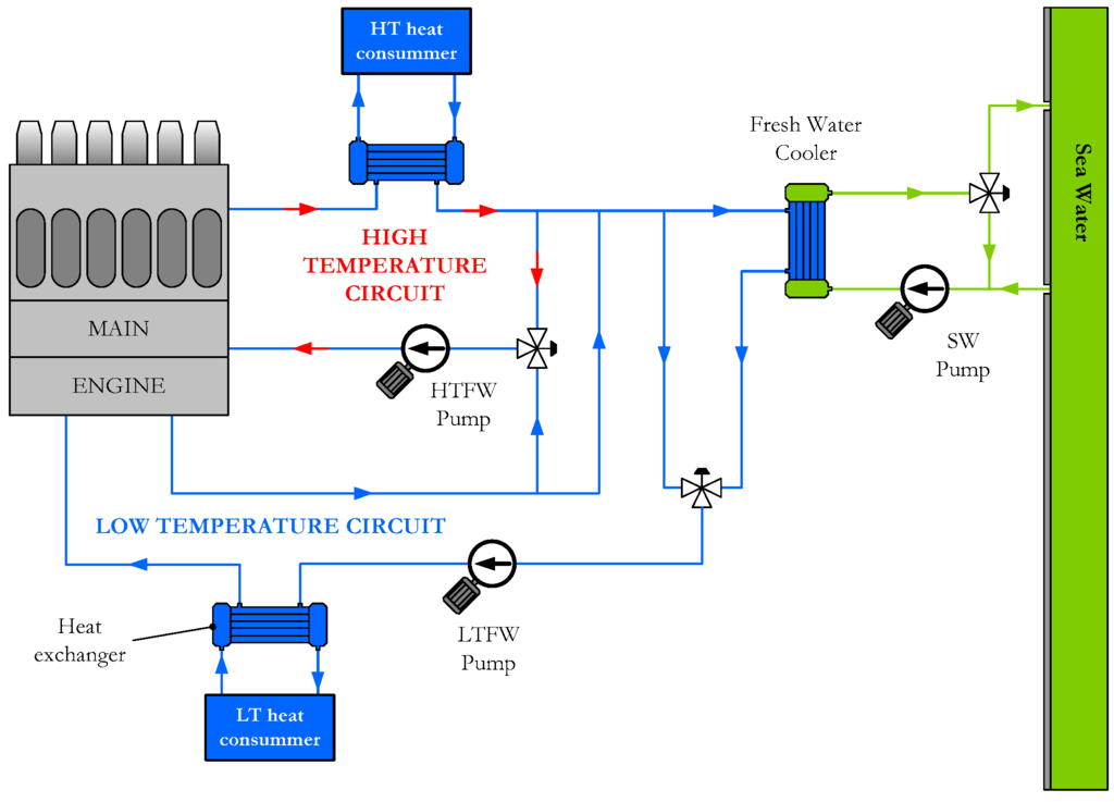 In this section, the engine is now represented with its cooling and exhaust circuits. The structure and the values of the circuits are based on a theoretical ship whose purpose is to illustrate the strengths and possibilities of the exergy analysis.