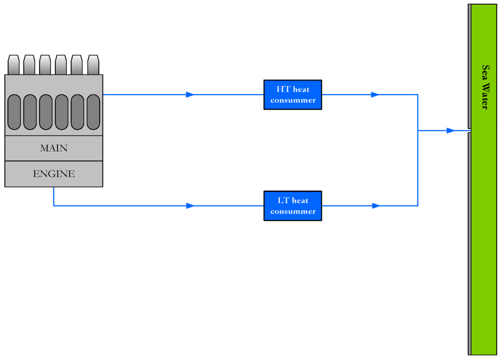The second figure shows the same system but with the previous “first law” approach. The network structure has disappeared; the engine high temperature (HT) and low temperature (LT) cooling powers now flow directly to the sea, feeding on their way potential heat consumers. A black-box approach is used. It is therefore obvious that, on the one hand, the new approach will require more models, more state variables, and therefore more computer time. However, on the other hand, it will describe essential systems such as engine cooling networks, waste heat recovery boilers, steam circuits, and heating, ventilation and air conditioning (HVAC) systems in more detail. It will also make possible the representation of new systems such as power turbines or Organic Rankine Cycle (ORC) systems. Finally, it will enable exergy analysis.