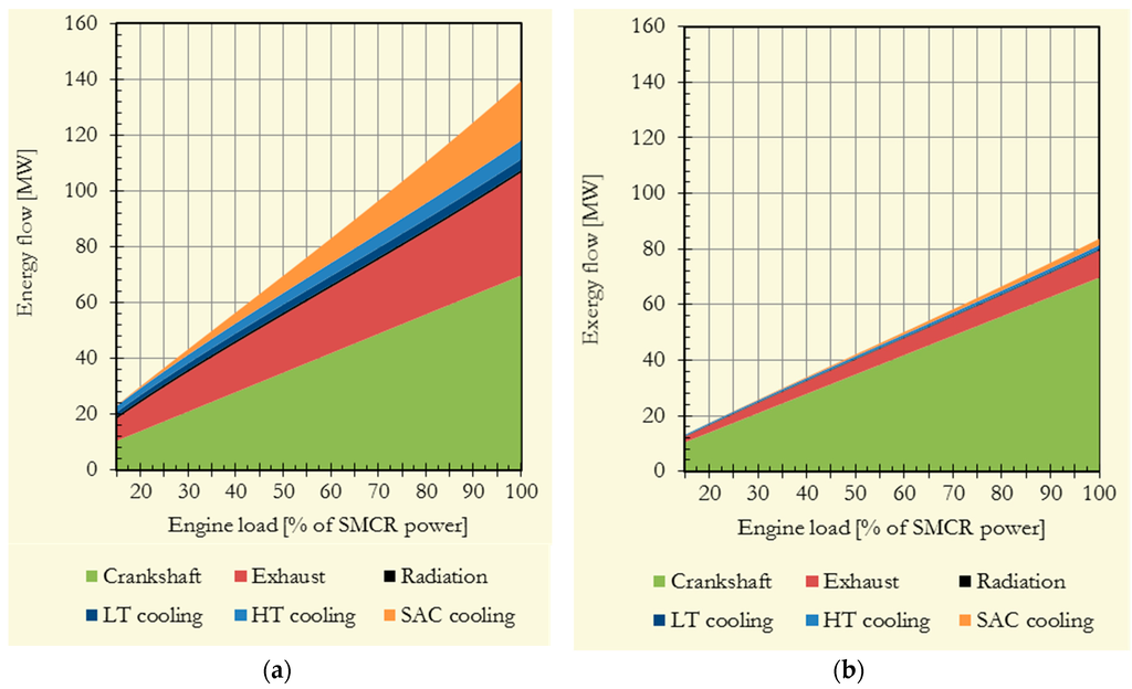 (a) Absolute output energy balance of the engine. (b) Absolute output exergy balance of the engine.