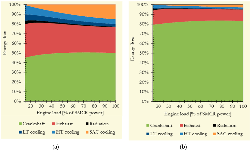 (a) Relative output energy balance of the engine. (b) Relative output exergy balance of the engine.
