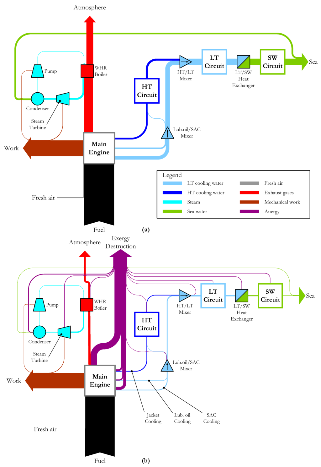 Today, engine cooling thermal powers have poor exergy content. The only way to increase their exergy content is to increase the engine cooling temperatures. Engines are cooled down to limit material fatigue and guarantee good lubrication (lubrication oils work best at a certain temperature). However, if the jacket cooling water is maintained at temperatures around 80 °C, this also serves to avoid evaporation. If engines were cooled down by thermal oil, the engine could be kept at a higher temperatures without risking evaporation. In the case of the engine, if it was cooled down by oil at 110 °C instead of water at 80 °C, the exergy production of the HT cooling circuit would increase from 991 kW up to 1370 kW. In the same way, if new lubrication oils working best at higher temperatures were used, the exergy production could be significantly increased. For example, with lubrication oil working at 80 °C instead of 36 °C, the exergy production of the LT cooling circuit would increase from 385 kW up to 820 kW. Applying the same logic to scavenge air cooling will not be necessarily advantageous. Increasing the temperature of the SAC cooling would mean increasing the cylinder air input temperature, which would degrade the engine volumetric efficiency. Finding an optimum balance between exergy production and engine efficiency would be an interesting study to carry out. Finally, the same logic could also be applied to the sea water cooling circuit. The temperature of the sea water cooling circuit is regulated to avoid salt precipitation that fouls the heat exchanger. This precipitation occurs around 35 °C. It could be avoided by using another fluid for cooling such as the fuel in fuel tankers. It could also be, not avoided, but ignored if the heat exchange between the LT circuit and sea water was not made through a heat exchanger but directly through the hull plating. In this case, the sea water circuit would be replaced by a fresh water circuit or simply deleted.