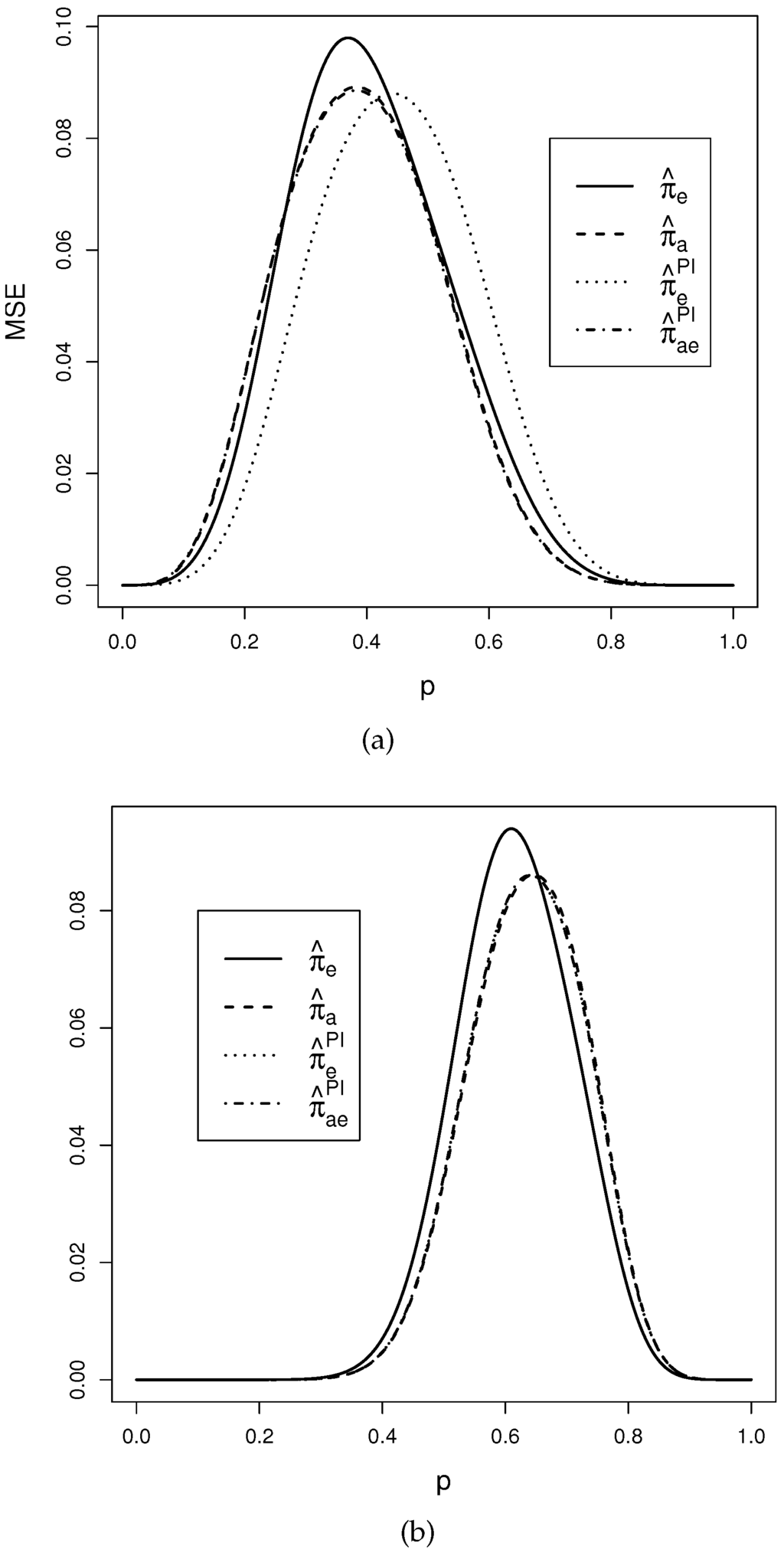In the case of the binomial test, it is possible to compute the exact expectation and the MSE of and , and . In order to make a comparison among these estimators, their exact bias and MSE are represented in Figure S1 and Figure S2 of the Supplementary Material. Here, in Figure 1, only the MSE curves with , , and , are given. From these figures, it emerges that there is no RP-estimator that uniformly performs best. Concerning the estimators for the power of , there is a tangible difference between the performance of and . For a wide range of small values of , has a bias and MSE, which is greater than the one of ; for large values of , generally performs better than ; whereas, the performances of and for the power of are very similar. Regarding RP-testing, we recall that there is no disagreement between classical binomial tests (exact or approximated) and their RP-based version. The results obtained here for the binomial test still hold for the sign test. The interested reader is referred to the Supplementary Material where the connection between these tests is explained in depth.