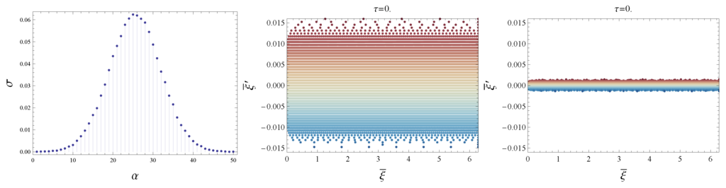 We report, here, numerical simulation results with beams for four distinct cases, which differ for the number of modes m and for the magnitude of the relevant Chirikov parameters: (i) and (only resonant modes); (ii) and (50 resonant modes and 70 linearly-stable modes); (iii) and ; (iv) and . The initial values of the modes are set with random phases and with random amplitude of for the resonant (linearly unstable) n modes, while the random amplitude of non-resonant (linearly stable) modes is of . The initial densities of the beams, i.e., the values (), are assumed Gaussian distributed in the velocity space as depicted in Figure 1 (left-hand panel), where we also plot the initial phase space for the cases (i), (ii) (central panel) and (iii), (vi) (right-hand panel).
