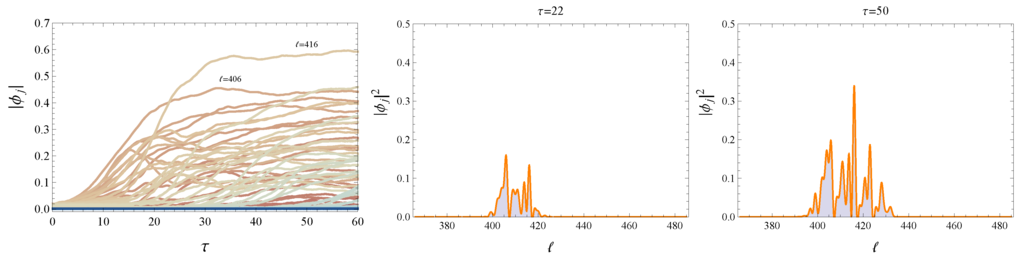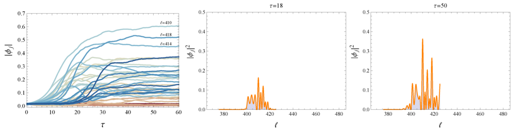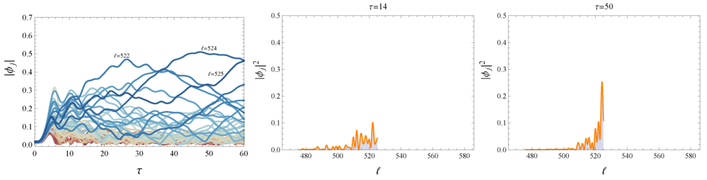 Case (i). Left-hand panel: temporal evolution of the mode amplitude ; colors are fixed from blue (largest ℓ) to red (smallest ℓ), and time-asymptotic dominant wave-numbers are indicated. Central and right-hand panels: intensity spectrum at different times.