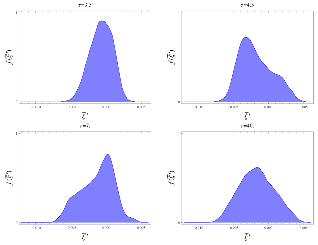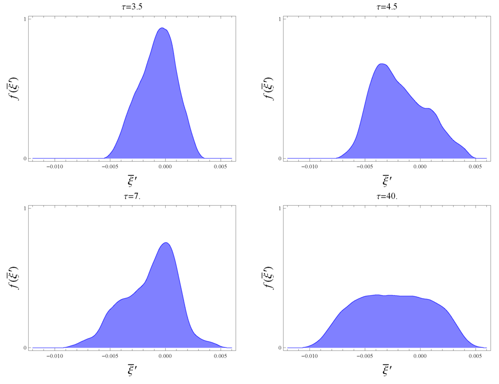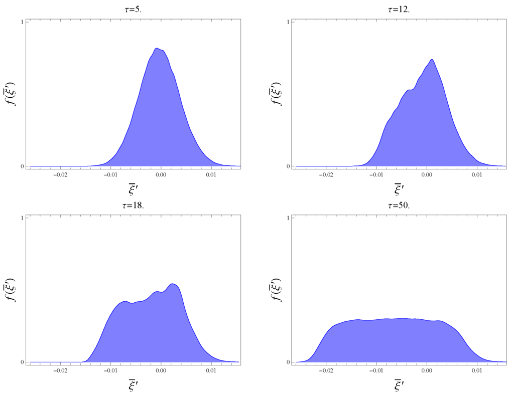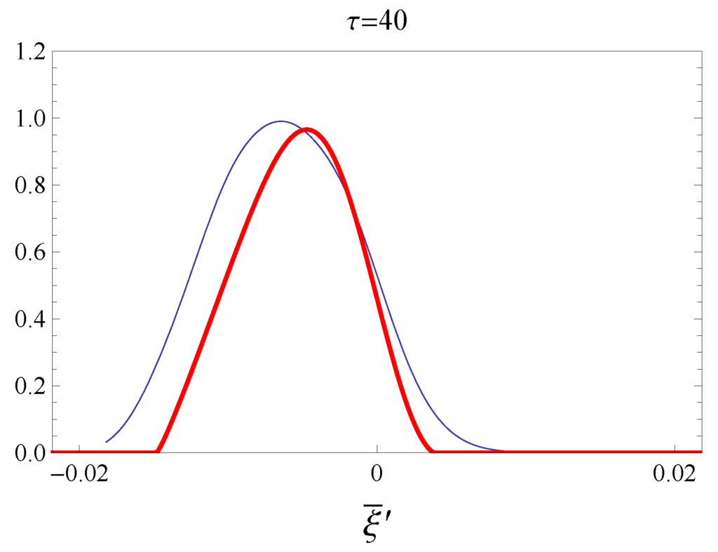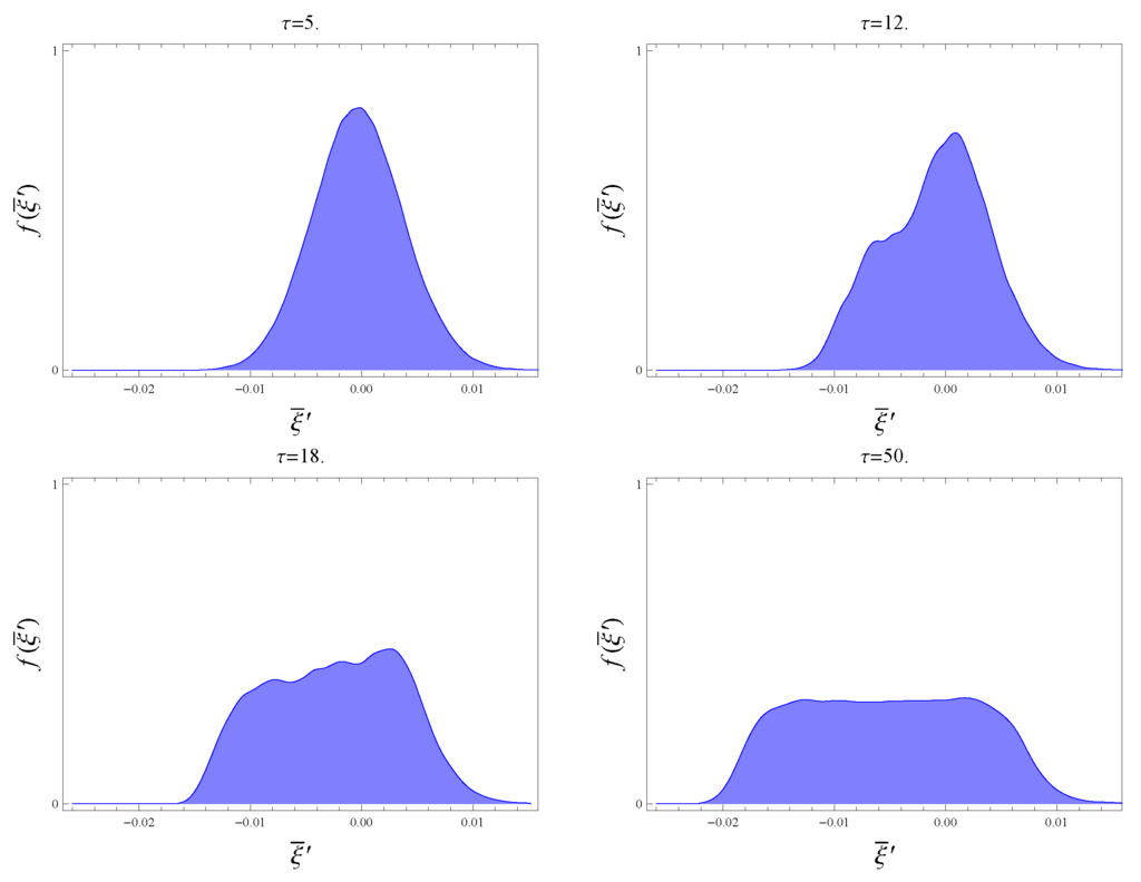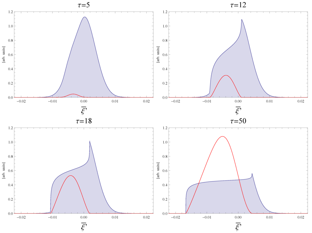 To illustrate the ability of Equation (30) to capture essential features of the broad beam relaxation for , as well as , we solve Equation (34) numerically and compare and , obtained from Equation (33), with the numerical simulation results for Case (i) discussed in Figure 2 and Figure 3. The initial conditions for are given in order to properly represent the Gaussian distribution of the simulation (see Figure 1), and for convenience, we also assign a Gaussian profile resembling the initial mode amplitude. The behavior of (red line) and (blue filled line) for different time steps is shown in Figure 14, well reproducing both the early stages of evolution and the plateau formation at later τ.