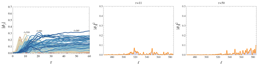 and . In this case, the mode evolution and the corresponding particle velocity distribution function, for a sufficiently large time, are consistent with the quasi-linear model prediction. In the left panel of Figure 2, we can observe the saturation of each spectral component, while the other two panels show the intensity spectrum at different times; with a peak structure shifting towards large ℓ, consistent with total energy conservation. This suggests, at least in the initial phase of the evolution, the presence of a convection (drag) in velocity space, reflecting the effect of weak coherent structures. Figure 3, time asymptotically, shows how the velocity distribution function evolves towards a plateau, consistent with quasi-linear diffusion. In other words, the dominant diffusion process is due to particles interacting with multiple modes with random phases. It is also worth observing how the coarse-grained features of this distribution function are consistent with the results obtained in [64]. Moreover, in that work, the energy spectrum is shown to have irregularities associated with significant jumps in the particle velocities, characterized by Gaussian distribution. Similar irregularities can also be observed in our energy spectrum, and therefore, we can conclude that they do not depend on the morphology of the initial fields phase (in [64], the initial phases are not taken as random).