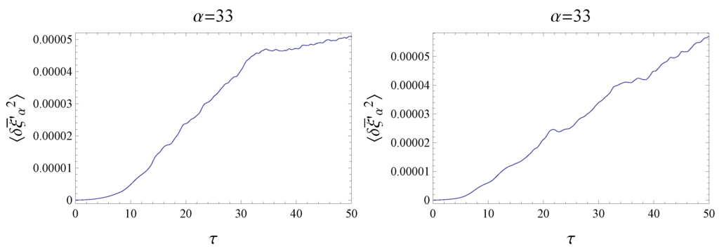 Here, can be estimated as , with the “autocorrelation time”, that is the time for particles to be scattered by randomization with respect to wave phases. Note that the nonlinearity parameters in Equation (4) and Equation (5) are connected as , with being a measure of the fluctuation spectrum width (), L the macroscopic system size and: