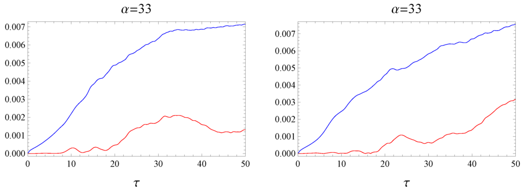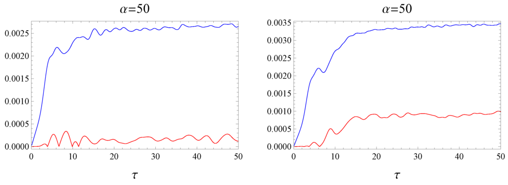 Overlap of the evolution of (blue line) and (red line), for test particles initialized at . Case (iii) in the left-hand panel and Case (iv) in the right-hand panel.