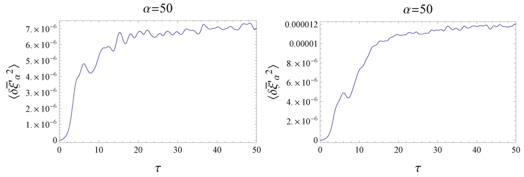 In this case, we get the following estimations: , , and (). This is consistent with the broad character of the considered spectrum, and condition Equation (27) is properly satisfied. Thus, we can conclude that Case (i), time asymptotically, can be described by the well-known quasi-linear approximation.