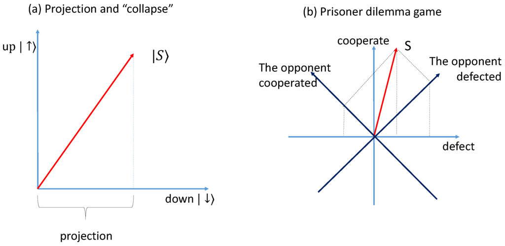 Two examples of the judgement and decision by quantum probability theory. (a) An example of projection: when measuring, the state will “collapse” onto the “down” basis with the probability that is determined by the squared length of the projection; (b) the case of the prisoner dilemma game: when the player does not know the opponent’s action, he or she may chose to defectwith a low probability. If he or she is informed about the opponent’s action, he or she will become more greedy and be more likely to defect.