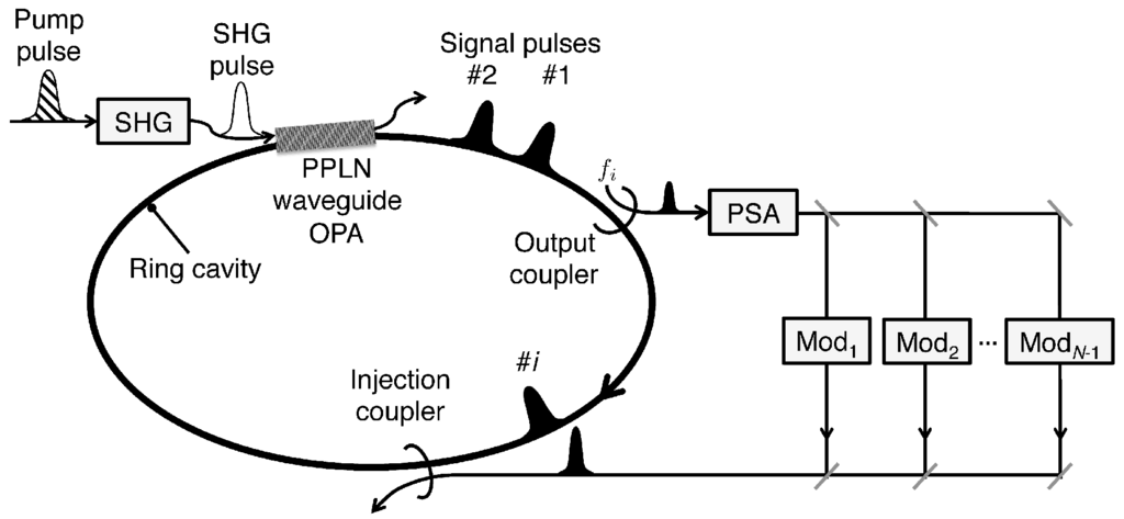 A CIM based on multiple-pulse DOPO with all-optical mutual coupling is shown in Figure 1. The system starts with a pulsed master laser at a wavelength of . A second harmonic generation (SHG) crystal produces the pulse train at a wavelength of , which, in turn, generates multiple DOPO pulses at a wavelength of inside a fiber ring resonator. If the round trip time of the fiber ring resonator is properly adjusted to N times the pump pulse interval, we can simultaneously generate N independent DOPO pulses inside the resonator. Each of these pulses is either in 0-phase state or π-phase state at well above the oscillation threshold and represents an Ising spin of up or down.