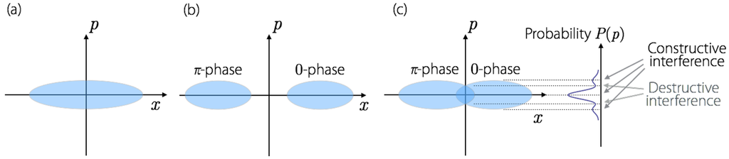 Each DOPO pulse in the coherent Ising machine shown in Figure 1 is in a squeezed vacuum state when a pump rate is well below the oscillation threshold (Figure 2a) and in a (squeezed) coherent state with either 0-phase or π-phase when a pump rate is well above the oscillation threshold (Figure 2b). At the critical point of the DOPO threshold, there exists a linear superposition of the 0-phase and π-phase states [32]. This fact can be easily confirmed by plotting the projection (homodyne) measurement statistics of the quadrature amplitude at the critical point as shown in Figure 2c. The constructive and destructive interference between the 0-phase and π-phase state is clearly seen when compared to the simple Gaussian distribution [30,33].