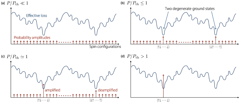 We recently proposed a novel computing system to implement the NP-hard Ising problems using the criticality of laser [24,25,26,27] and degenerate optical parametric oscillator (DOPO) phase transition [28,29]. The invention of this machine is motivated by the well-known principle of laser and DOPO in which the mode with a minimum loss rate is most likely to be excited first. The energy of the Ising Hamiltonian can be mapped onto the total loss rate of the laser or DOPO network. The selected oscillation mode in the laser or DOPO network corresponds to the ground state of a given Ising Hamiltonian, while the gain available to all other modes is depleted due to the cross-gain saturation. This means that a mode with the lowest loss rate reaches a threshold condition first and clumps the gain at its loss rate, so that all the other modes with higher loss rates stay at sub-threshold conditions.