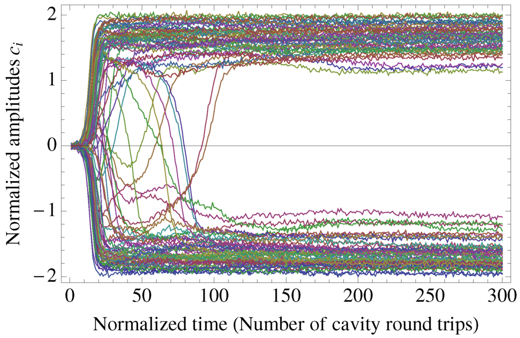 Normalized DOPO signal amplitudes when CIM is solving MAX-CUT is shown. Each trajectory describes a DOPO.